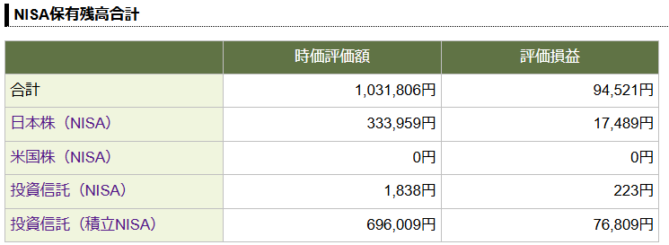 このうち、日本株(NISA)の評価損益は17,489円、投資信託(つみたてNISA)は223円、投資信託(つみたてNISA)は76,809円のプラスとなっています。