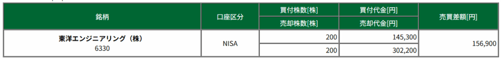 今回売却したのは、東洋エンジニアリング(6330)です。購入代金145,300円で買った株を、302,200円で売却し、売買差額は156,900円のプラスとなりました。