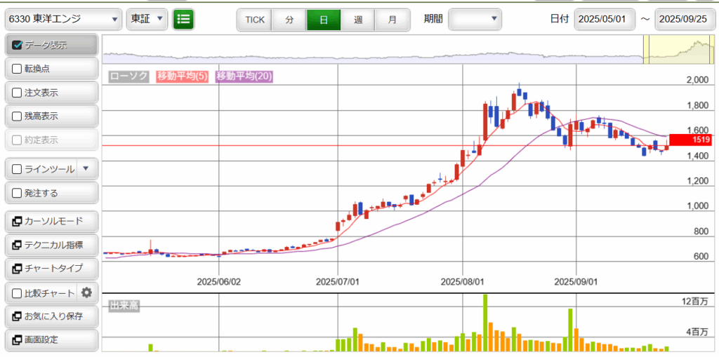 チャートの見方も人それぞれと思いますが、8月半ばをピークに20日移動平均線を下回ってしまった。その後もそれが抵抗線になってタッチしては下落となっていることが分かります。